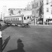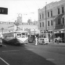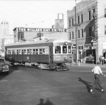 DIGITAL PRINT: Texas Electric Railway Passenger Motor 308 turns left off of Commerce Street, outbound for Lancaster. Passengers are visible through the windows of the car. An unidentified man crosses Commerce Street in front of the car while two unidentified women stand on the corner opposite him, soon to be blocked from vision by the turning car. Cars are traveling to the right of the car as well as behind the car going the opposite direct...