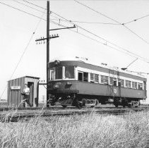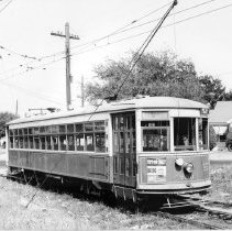 DIGITAL PRINT: Texas Electric Railway Passenger Motor 308 stopped at Ash Siding, inbound to Waco. The operator appears to move to reboard the car. See: Map 4, Detail 40