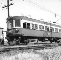 DIGITAL PRINT: Texas Electric Railway Passenger Motor 308 stops at Ash Siding, inbound to Waco. Anthony F. Krisak, a rail fan and photographer, is walking away from the car while another rail fan can be seen through the front windows. See: Map 4, Detail 40