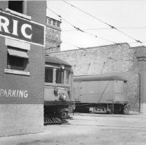 DIGITAL PRINT: Texas Electric Railway Express Motor 509 and Express Trail car 601 stand at the Dallas Freight Depot. Photo taken from Jefferson Street (now Record Street); a corner of the Jefferson Hotel can be seen over the cars in the middle of the frame. See: Map 8, Detail B