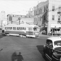 DIGITAL PRINT: A Dallas Railway & Terminal Company PCC (Presidents Conference Committee Car), possibly car 623, turns off of Commerce Street in downtown Dallas toward Seventh Street according to the destination sign. It's followed by another PCC and a passenger motor; both unidentified. The car is visibly full of passengers. In the right foreground, a Plymouth model taxi drives away from the car. On the corner of Commerce and Record are t...