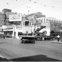 DIGITAL PRINT: A Dallas Railway & Terminal Company Maintenance car turns the corner off of Commerce Street, near the Old Red Courthouse, onto Houston Street. Crane Car 503 appears to have materials ready to move once the destination is reached. Three men hang on the wiring of the crane while pedestrians watch from the sidewalk. See: Map 8
