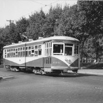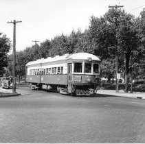DIGITAL PRINT: Texas Electric Railway Passenger Motor 360, outbound to Denison, travels down a city street; possibly Bryan or Matilda St. A 1938 Plymouth is parked to the left of the car. A slightly different view of this same scene is found in photo CP.2012.CL.9-30. See: Map 8