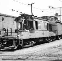 DIGITAL PRINT: Texas Electric Railway Class B Work Motor 905 at the Waco Terminal. Express (box) Trail Car 619 is behind the locomotive. A slightly different view of this same scene is found in photo CP.2012.CL.9-54. See: Map 7, Waco Downtown Detail