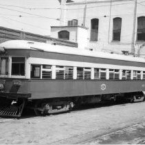 DIGITAL PRINT: An unoccupied Texas Electric Railway Company Passenger Motor 317 at the Waco Passenger Terminal. This car was red and cream in color, with a silver roof. It had arrived at the terminal at 8:25 a.m. A slightly different view of this same scene is found in photo CP.2012.CL.9-55. See: Map 7, Waco Downton Detail
