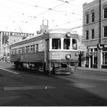 DIGITAL PRINT: Texas Electric Railway Passenger Motor 309 travels near the corners of Commerce and Record streets in downtown Dallas. It is approaching the left turn onto Record Street, outbound to Waco. The Willard Hat Company building stands prominently in the background. See: Map 8