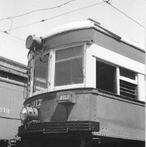 DIGITAL PRINT: Here, a closeup of front end of Texas Electric Railway Passenger Motor 317 beside partially visible box trailer 619 is framed. The two cars are at the Waco Terminal. See: Map 7, Waco Downtown Detail