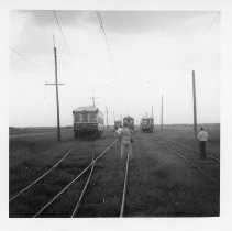 SNAPSHOT: Texas Electric Railway Passenger Motors northbound at Niles Siding; view looking south. Here, four Passenger Motors have converged. Three of the cars are northbound; cars 314 and 316 are on the left or east track while 328 is on the west track. A fourth car, unidentified, is southbound on the main (middle) track. Several CERA Railfan members can be seen taking photographs of the four cars from various locations. Niles Siding was j...