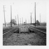 SNAPSHOT: Dallas Railway and Terminal streetcar 709 entering Oak Cliff, on a private right-of-way, after crossing the Trinity River bridge. The bridge and Dallas skyline can be seen dimly in the far right background. The sign between tracks reads: Private Right of Way No Trespassing D. Ry. & T. Co. See: Map 3, 8